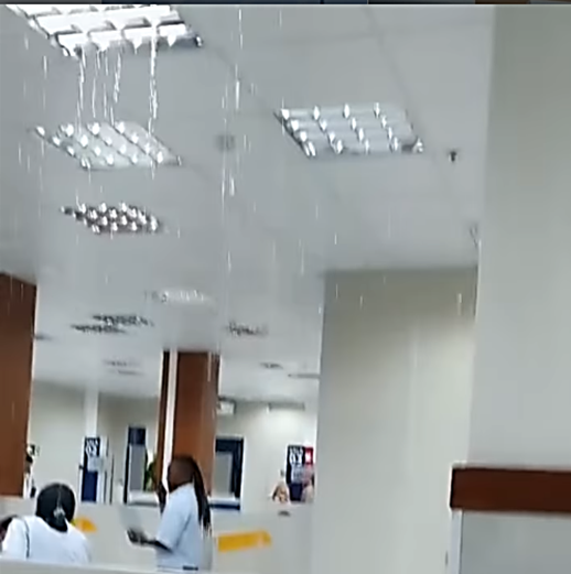 Nas imagens, é possível ver uma grande quantidade de água descendo pelo forro do SAC nas salas de atendimento do órgão.