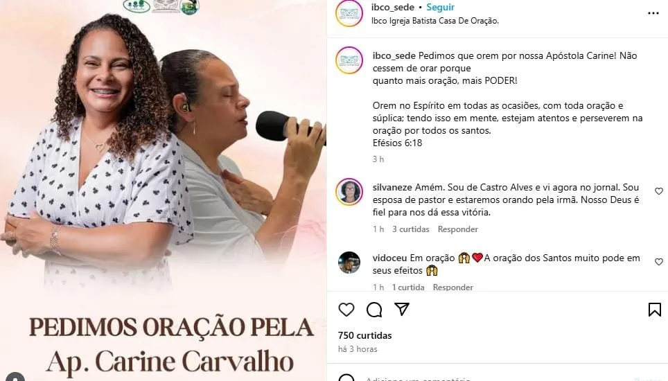 A Igreja Batista Casa da Benção fez uma publicação em seu perfil no Instagram pedindo orações para a apóstola. “Pedimos que orem por nossa apóstola Carine! Não cessem de orar porque quanto mais oração, mais poder!”, diz um trecho da postagem.