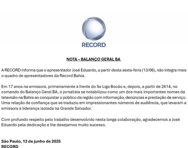 No comunicado, a emissora destacou o papel de José Eduardo na consolidação da audiência local e seu reconhecimento junto ao público por pautas de denúncia, prestação de serviço e informação. A saída marca o fim de uma trajetória iniciada em 2007, que contribuiu diretamente para o crescimento da emissora na Grande Salvador.