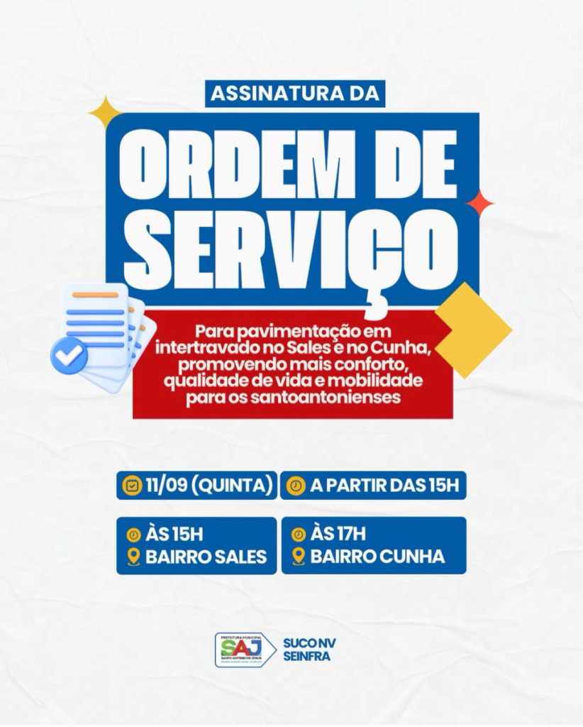 A Prefeitura Municipal de Santo Antônio de Jesus, por meio da Secretaria de Infraestrutura (SEINFRA) e da Superintendência de Convênios (SUCONV), realizará as assinaturas das ordens de serviço para a pavimentação em intertravado no Sales e Cunha.