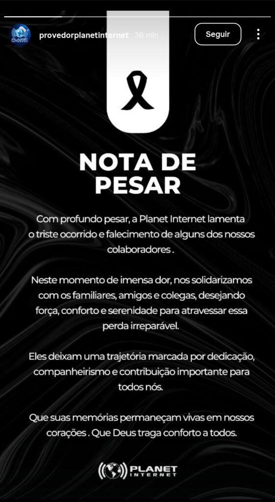 Com profundo pesar, a Planet Internet lamenta o triste ocorrido e falecimento de alguns dos nossos colaboradores.