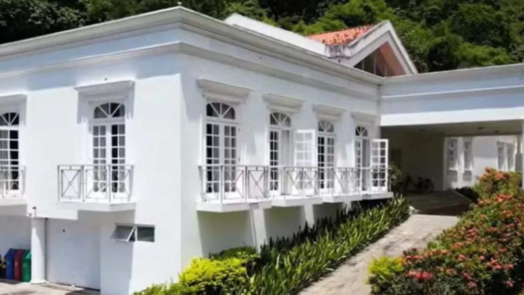 A mansão tem 3.000 m² de área construída em um terreno com mais de 400.000 m² de área útil. O local conta com guarita para controle de acesso, heliponto, quadra de tênis e vagas para até dez carros na garagem.