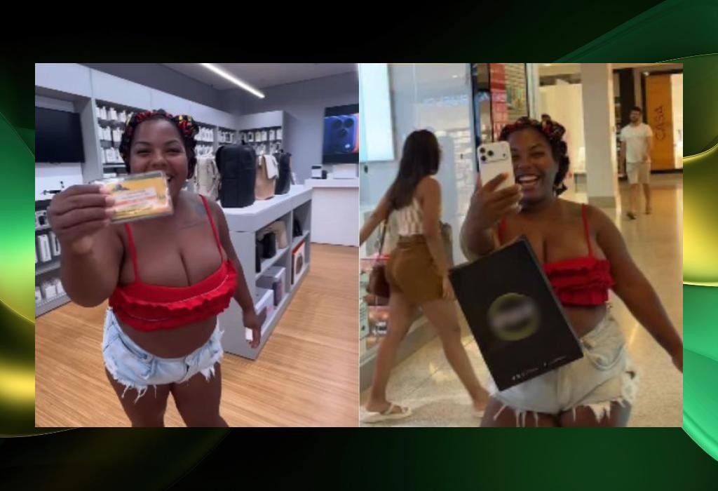 No registro, a mulher chega em uma loja de celulares pedindo o aparelho de última geração e afirma que vai pagar com o cartão do benefício. “Meu cartão da Bolsa Família foi liberado para pegar meu iPhone 17 Pro Max”, escreveu ela.
