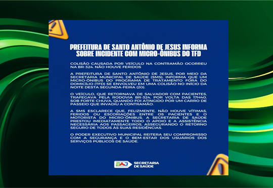 Prefeitura de Santo Antônio de Jesus informa sobre incidente com micro-ônibus do TFD
