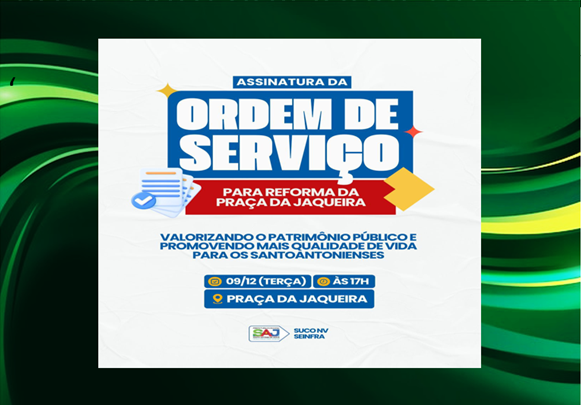 A Prefeitura Municipal de Santo Antônio de Jesus, através da Secretaria de Infraestrutura (SEINFRA) e da Superintendência de Convênios (SUCONV), realizará a assinatura da Ordem de Serviço que marca o início da reforma da Praça da Jaqueira. O evento será realizado na próxima terça-feira (09), a partir das 17h, na Praça da Jaqueira. A ação … continue