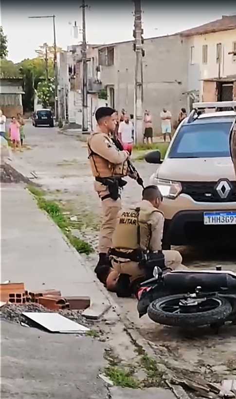 Nas imagens registradas por moradores, aparecem policiais de uma guarnição tipo caminhonete, identificada pelo número 8.1438, do 14º Batalhão, além de uma viatura menor de placa THH-3G97, que também estava presente no local. Os agentes tentavam algemar um homem que estava caído ao solo e, aparentemente, em surto.